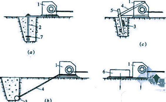 2. 地錨法:用地錨固定上卷揚機,并通過地錨把力傳給,此方法在工地使用為常見。